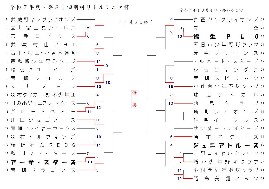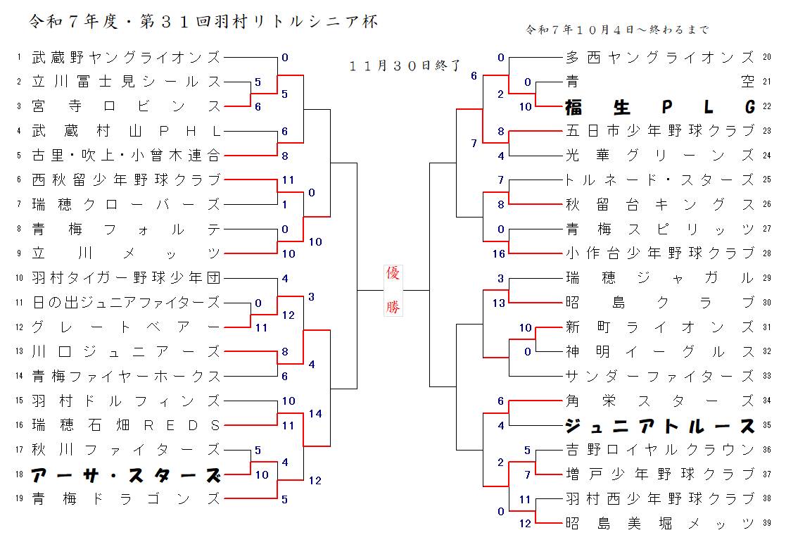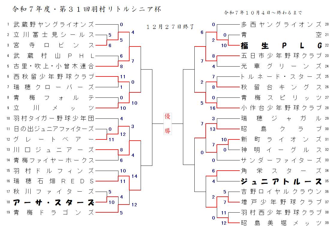 | 12/8 | 羽村シニアG | ① | 9:00 | アーサ・スターズ | 角栄スターズ | ||