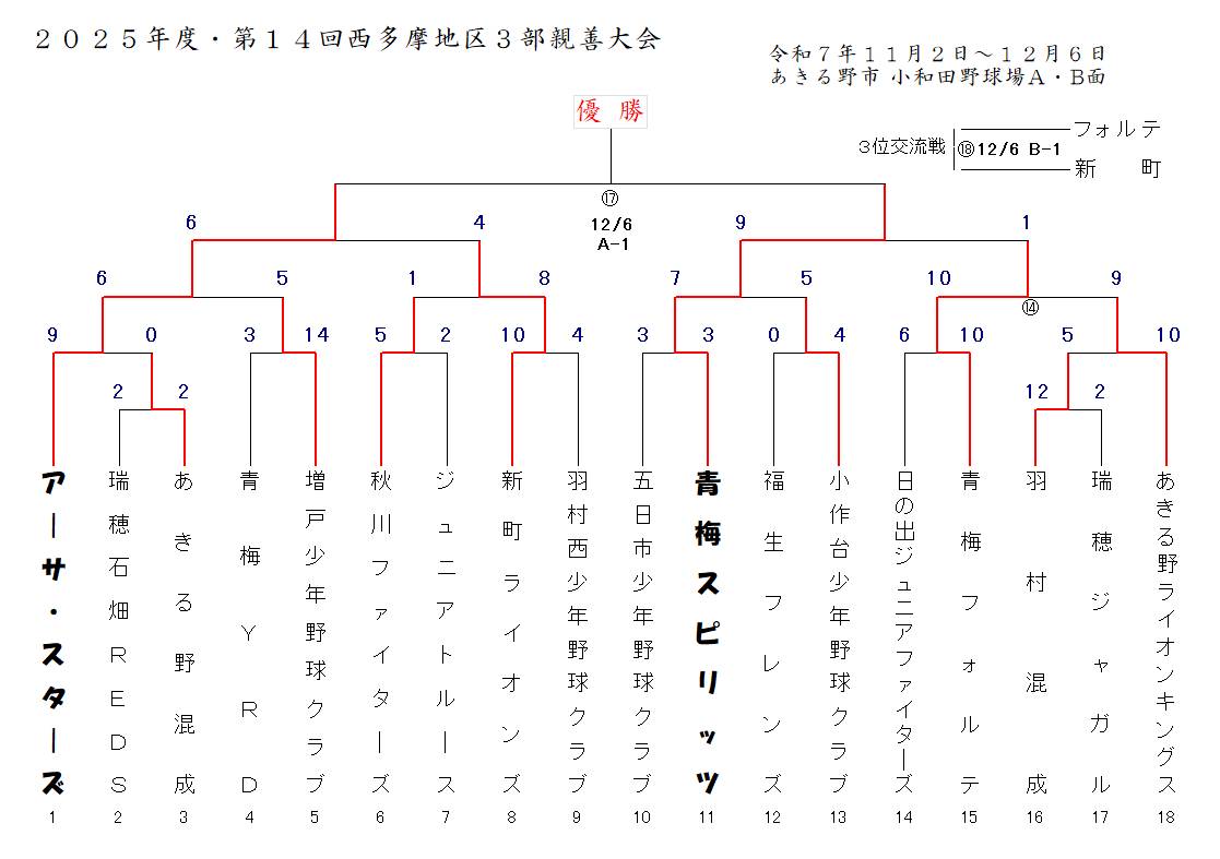 | 12/6 (土) | 小和田A | 1 | 9:00-10:00 | ⑰ | アーサ・スターズ | 決勝戦 | 青梅スピリッツ | 連盟 |