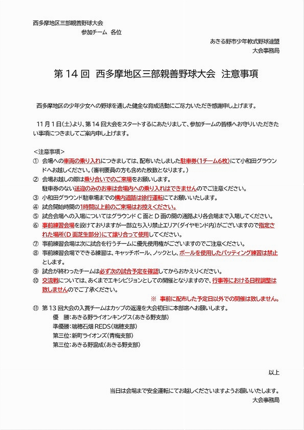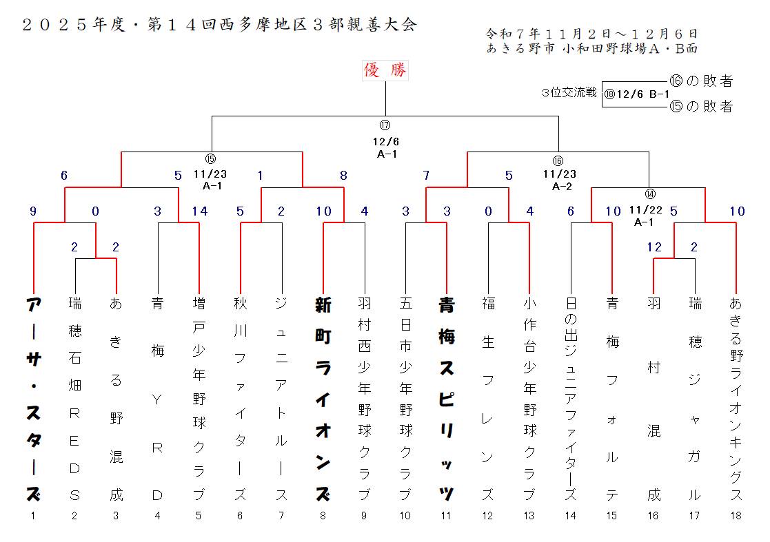 | 3 | 11:20-12:20 | ⑫ | 秋川ファイターズ | 1-8 | 新町ライオンズ | ⑬ | ||