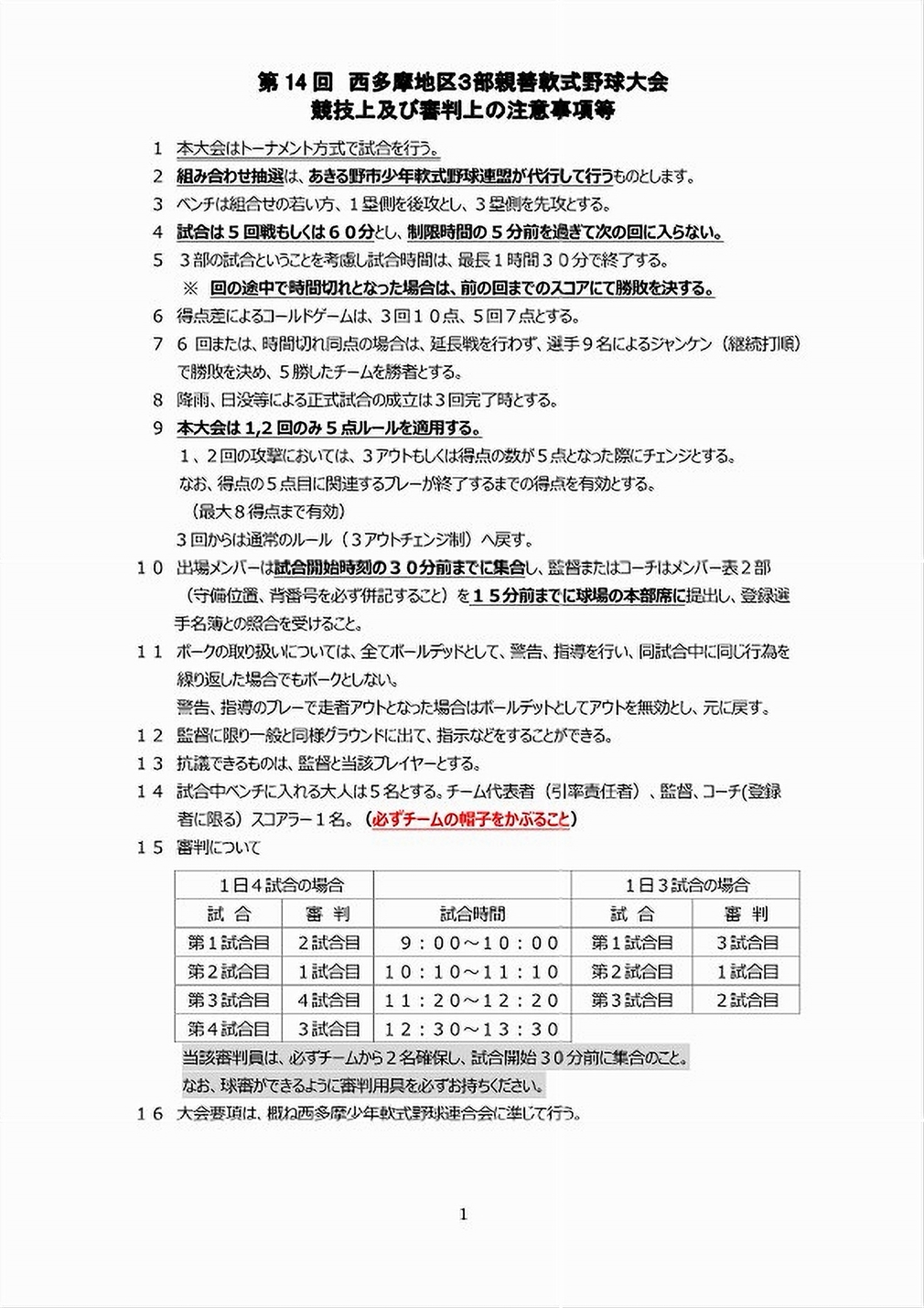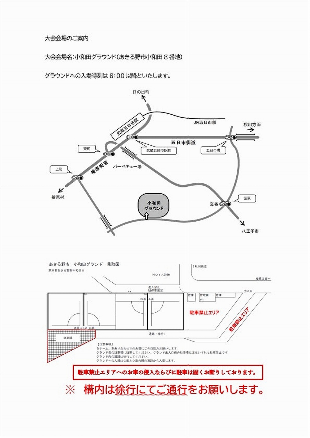 | 小和田B | 1 | 9:00-10:00 | ⑧ | 五日市少年野球クラブ | 3-③ | 青梅スピリッツ | ⑦ | |