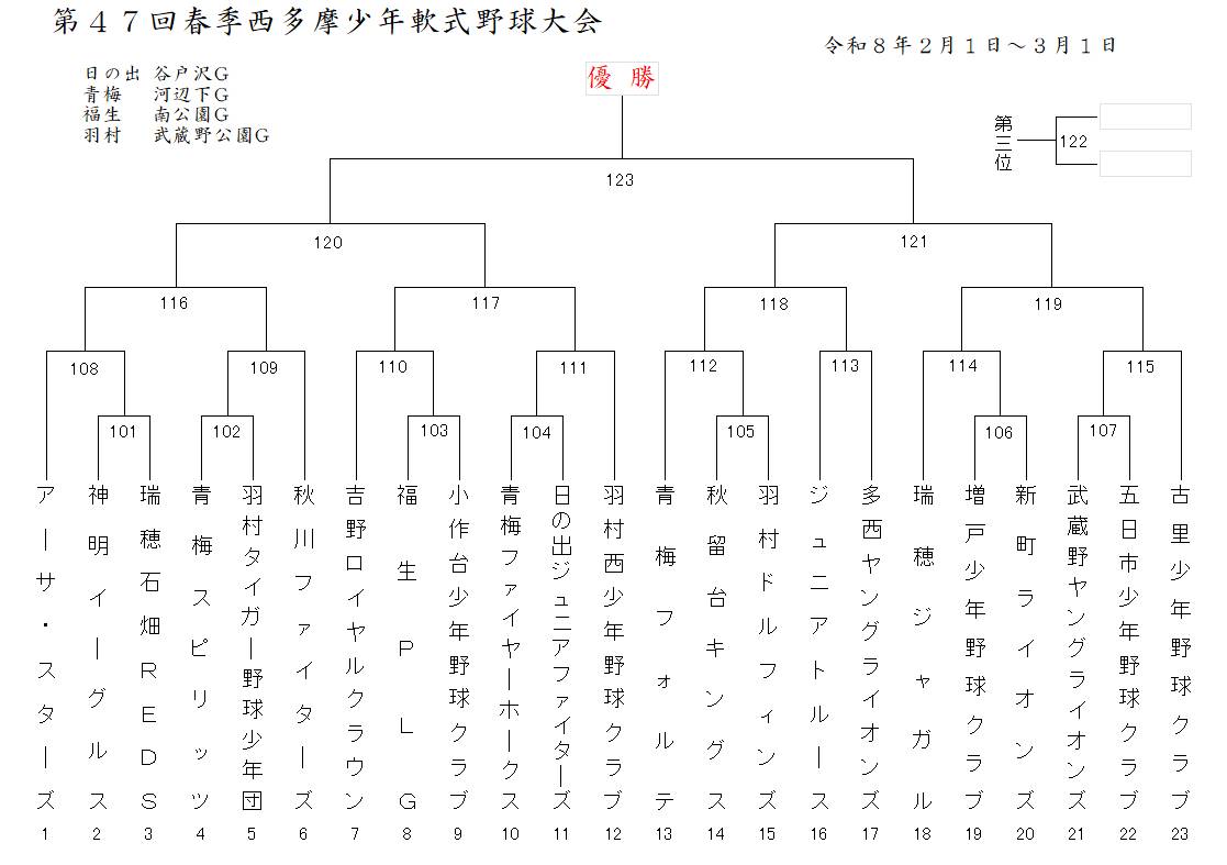 | 第46回 (R7) | 羽村西少年野球クラブ | 小作台少年野球クラブ | 福生PLG |